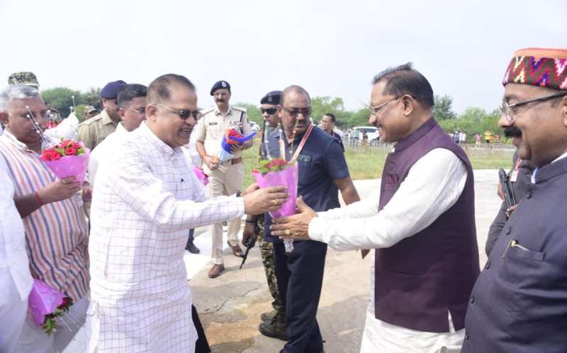 मुख्यमंत्री विष्णुदेव साय का बिलासपुर पहुंचने पर हेलीपैड पर स्वागत
